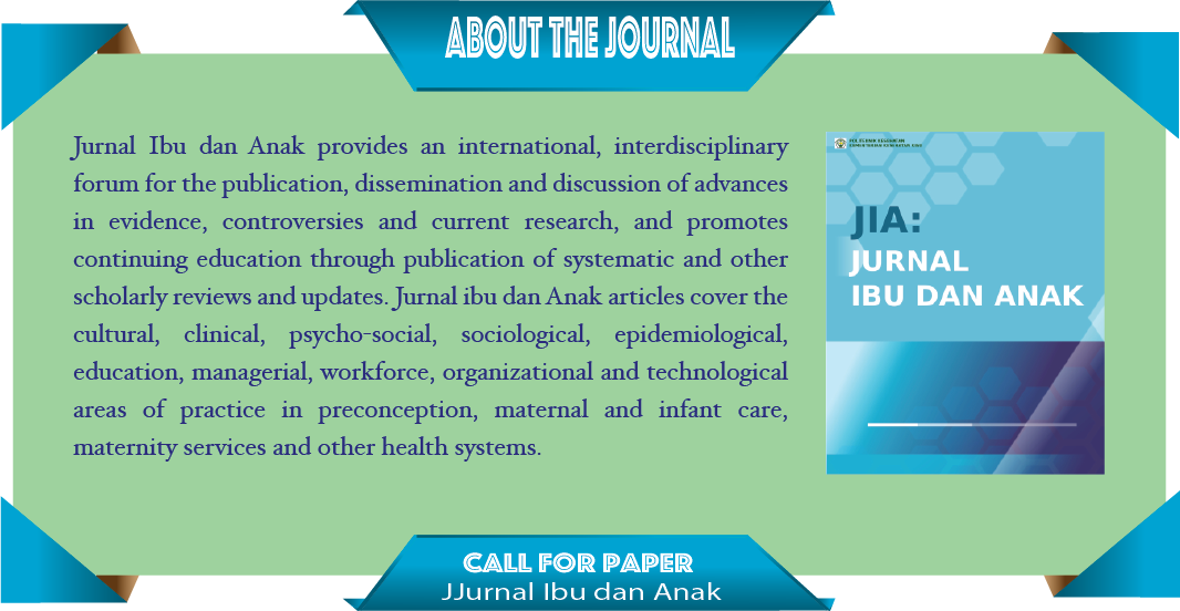 Jurnal Ibu dan Anak is a double-blind peer-reviewed journal published twice on May and November. It is dedicated to promoting scholarly exchange among teachers, practitioners and researchers in the field of midwifery.